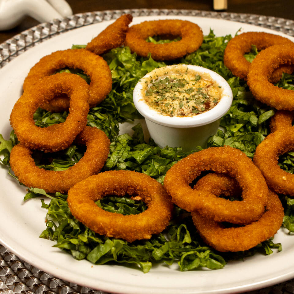12 piezas de aros de cebolla acompañados de 1 dip de salsa de la casa