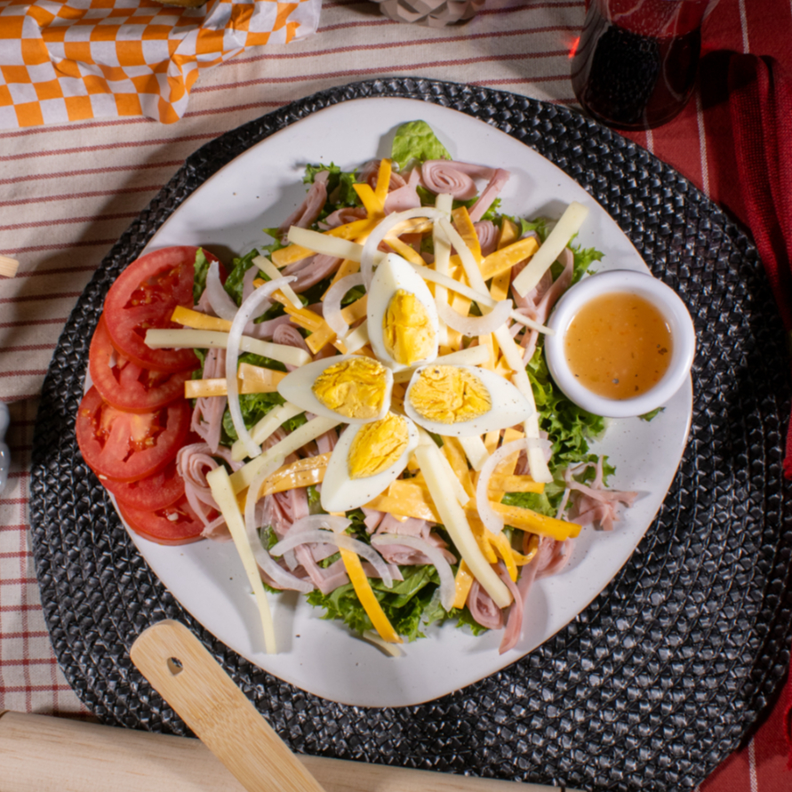 combinado de lechuga, quesos gouda y americano, jamon de pierna y huevo duro