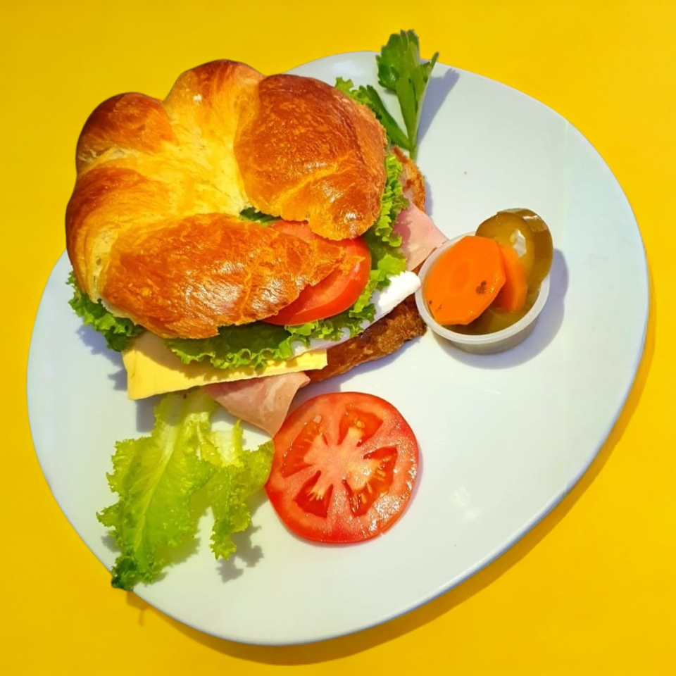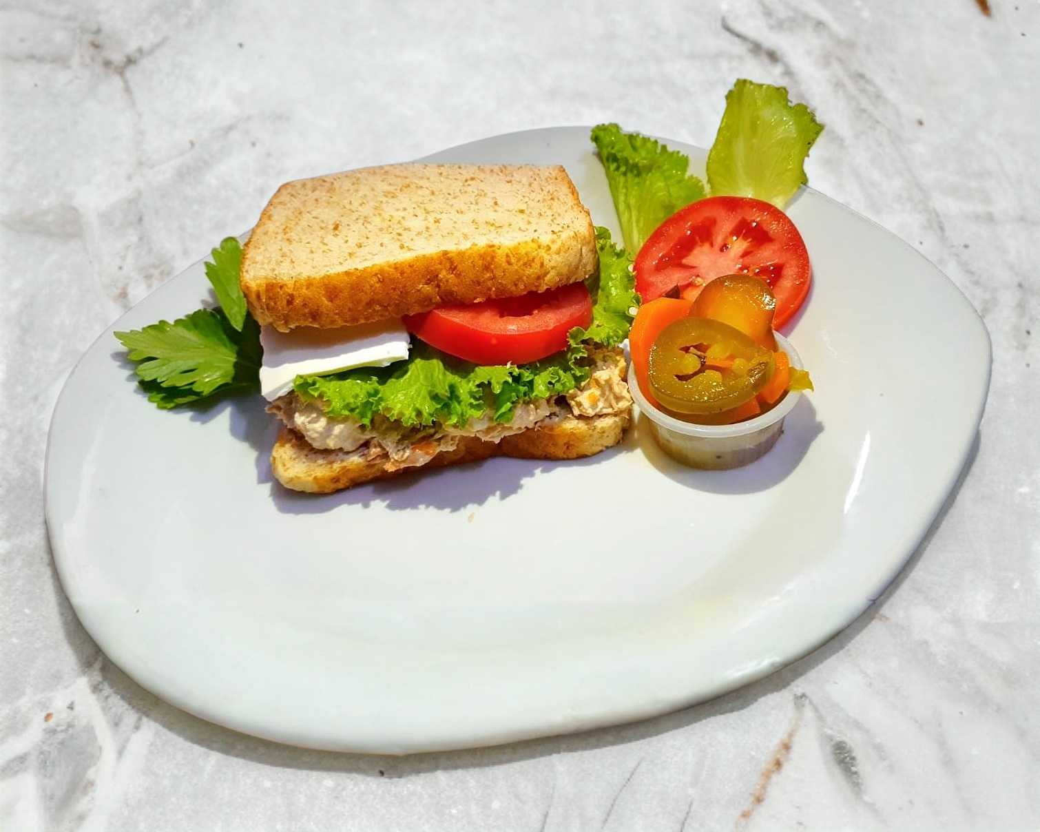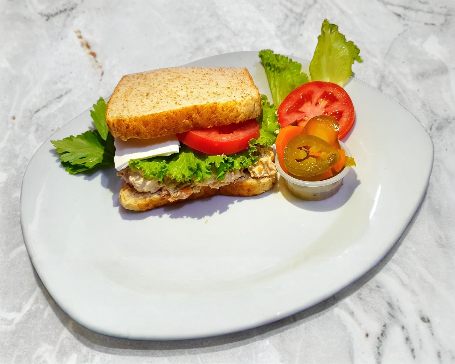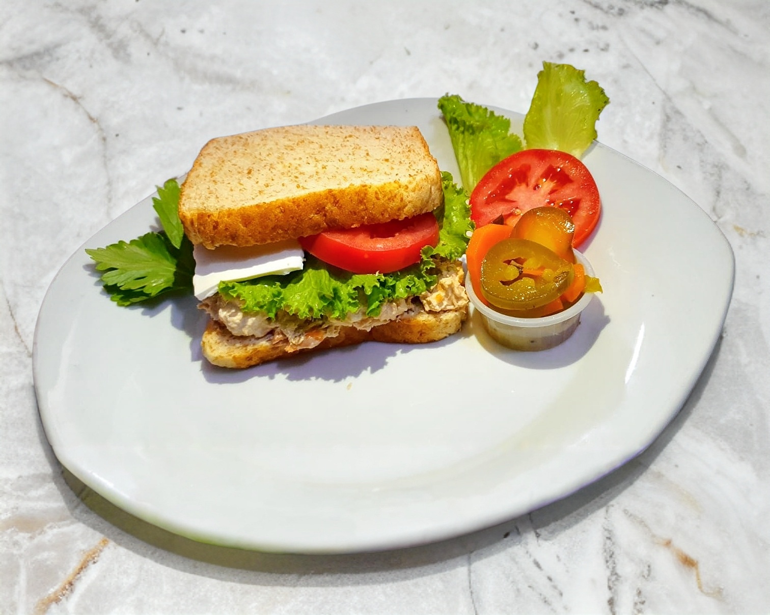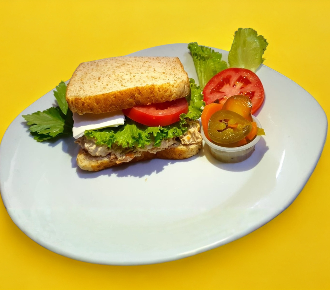 Pan integral, mayonesa, queso amarillo, queso panela, tomate, aguacate, dos rebanadas de jamón de pavo y lechuga italiana.