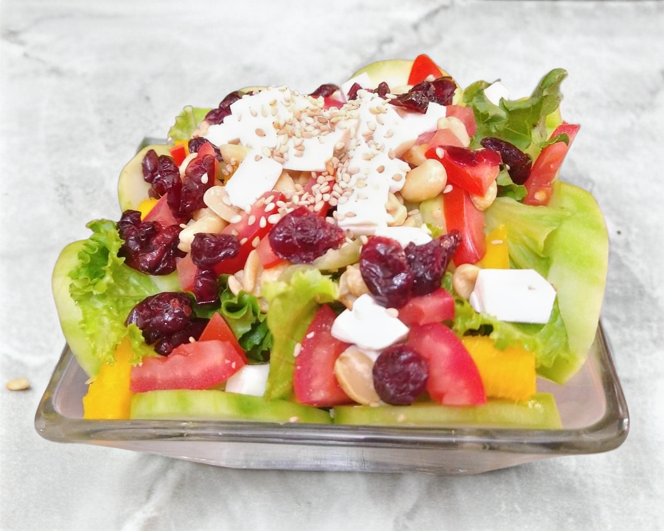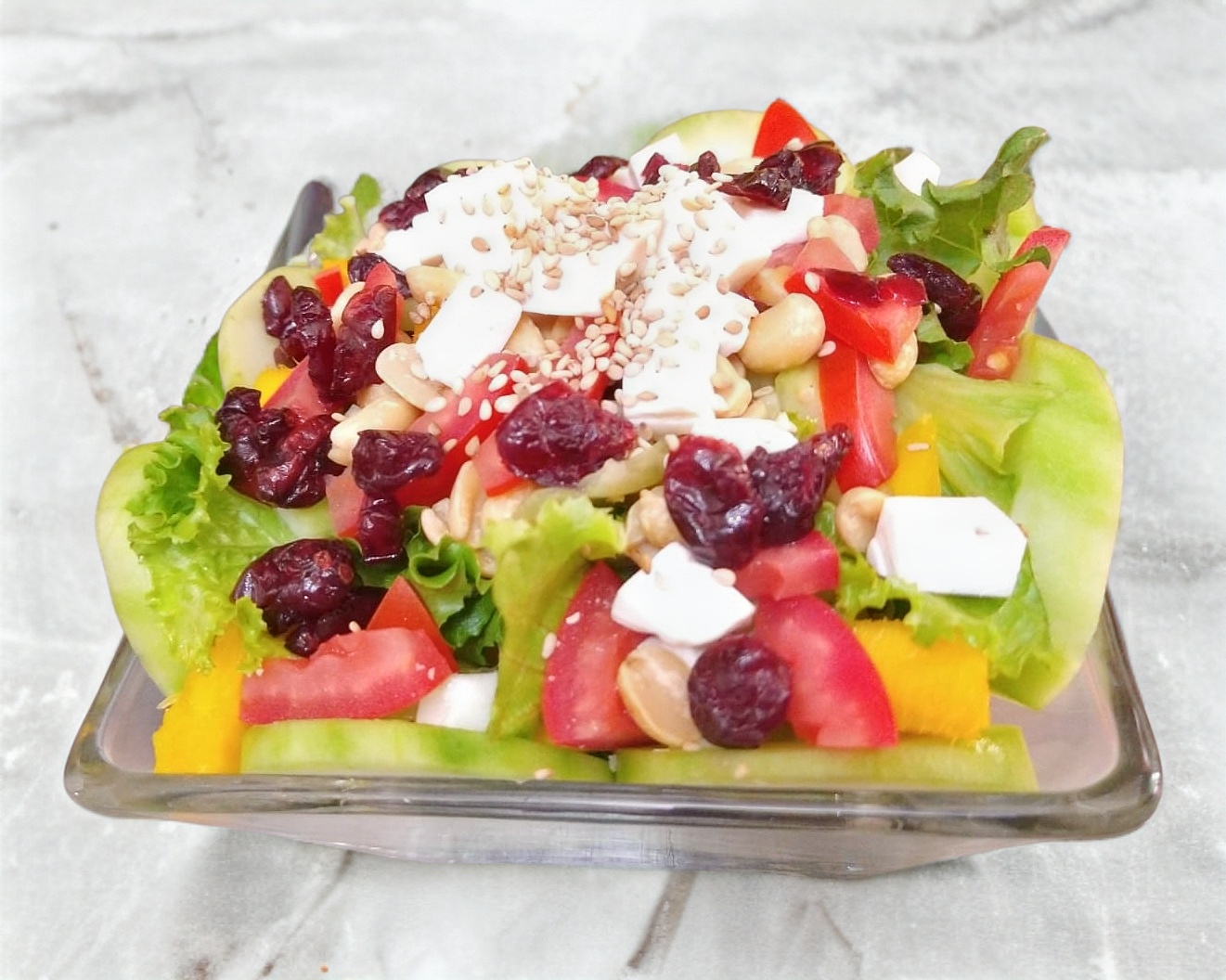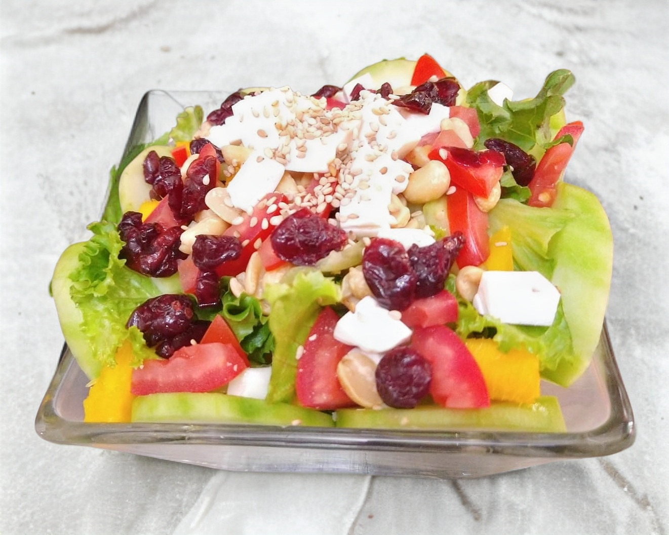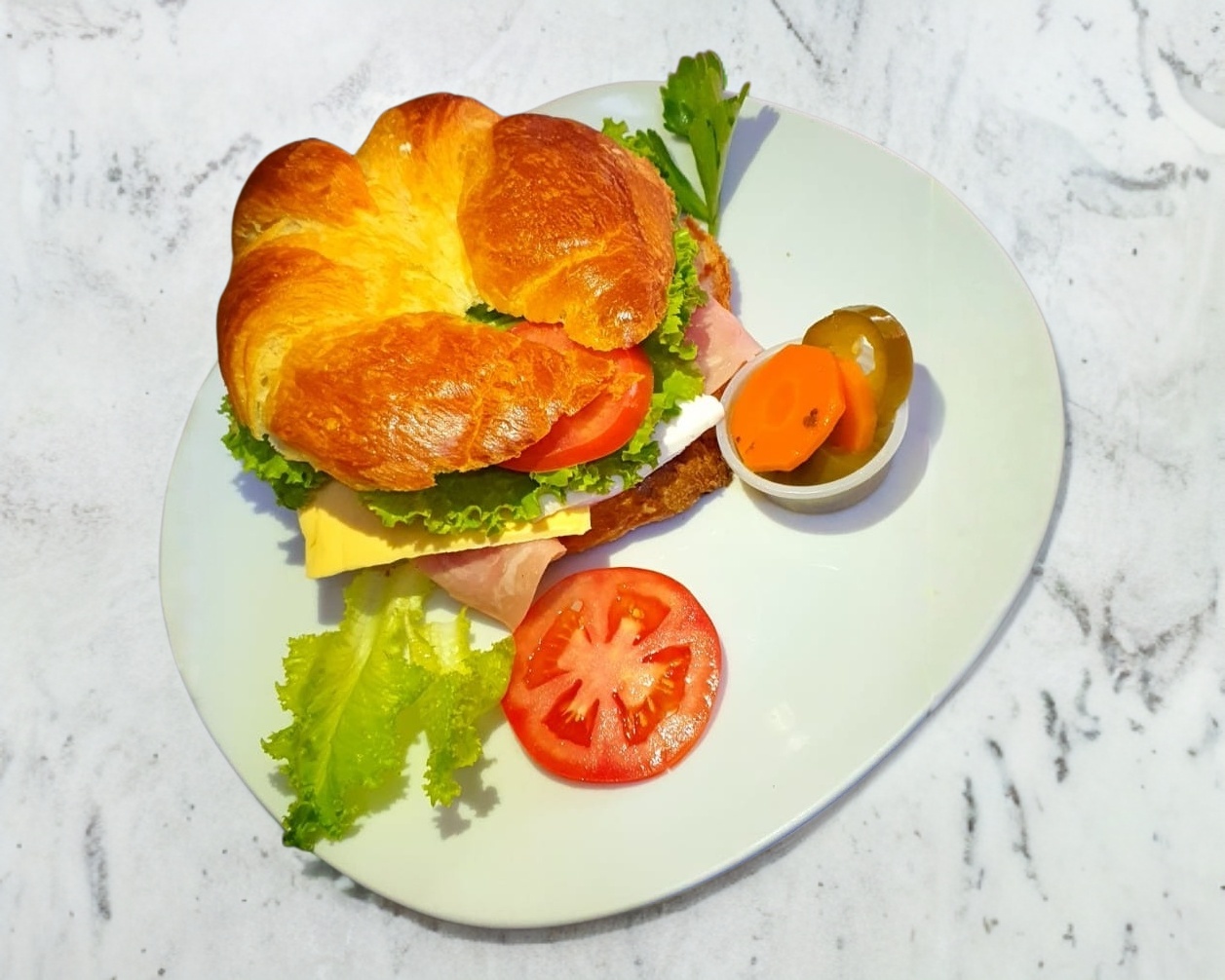 Pan integral, mayonesa, queso amarillo, queso panela, tomate, aguacate, dos rebanadas de jamón de pavo y lechuga italiana.