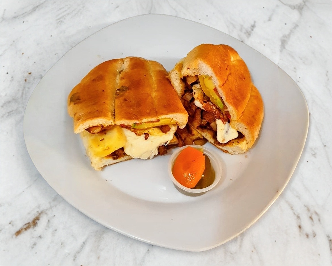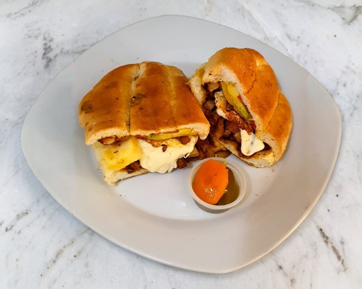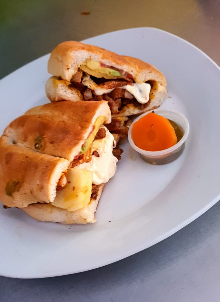 Pan integral, mayonesa, tomate, aguacate, queso panela, queso amarillo, lechuga italiana y pechuga empanizada o milanesa de pollo.