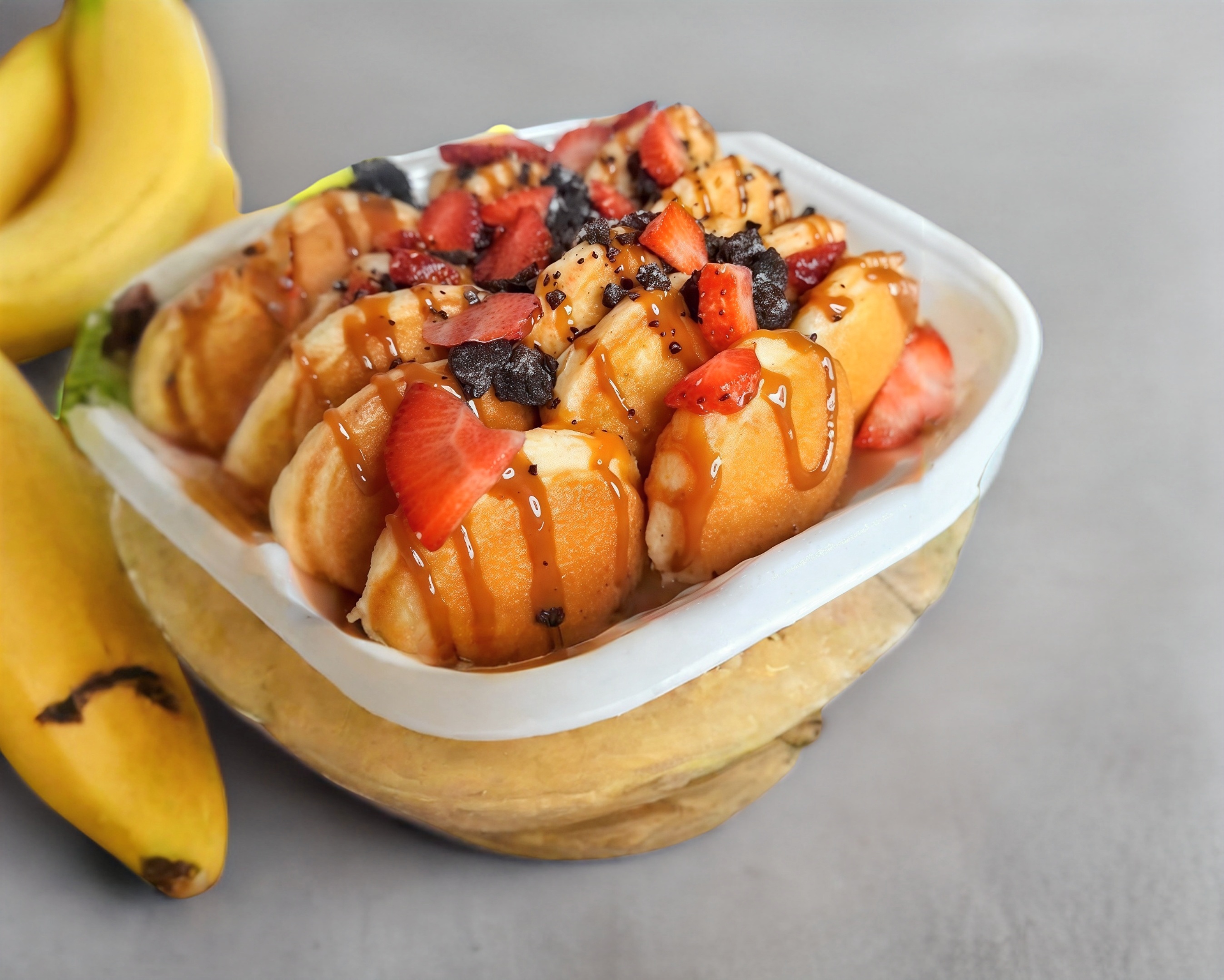 2 topping a elegir+fruta+bola de helado+chocolate liquido