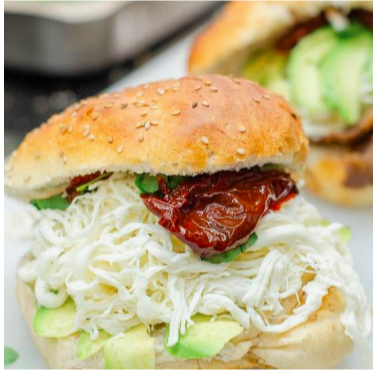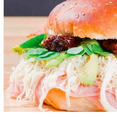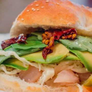 Cemita con base de pavo ahumando con quesillo, aguacate, chipotle, pápalo y aderezada con vinagreta de la casa.