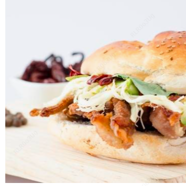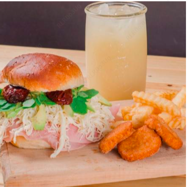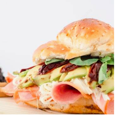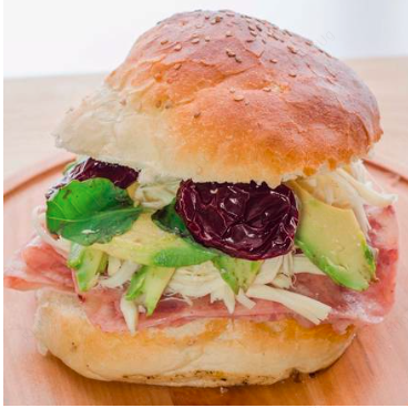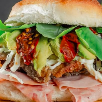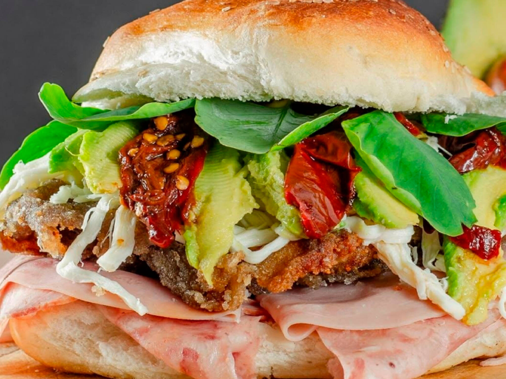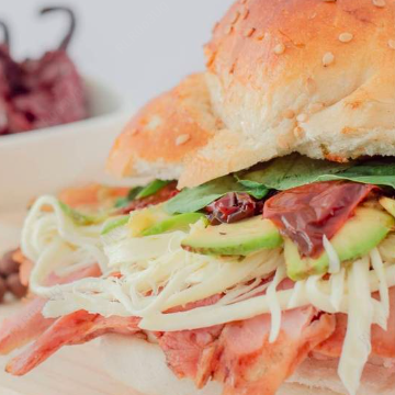 Cemita con base de milanesa de res o pavo ahumado o milanesa de pollo, con jamón, queso de puerco y pierna quesillo, aguacate, chipotle, pápalo y aderezada con vinagreta de la casa.