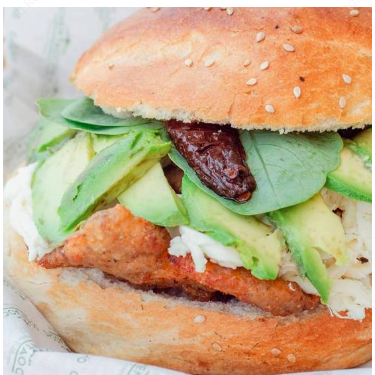 Cemita con base de milanesa de pollo con quesillo, aguacate, chipotle, pápalo y aderezada con vinagreta de la casa.