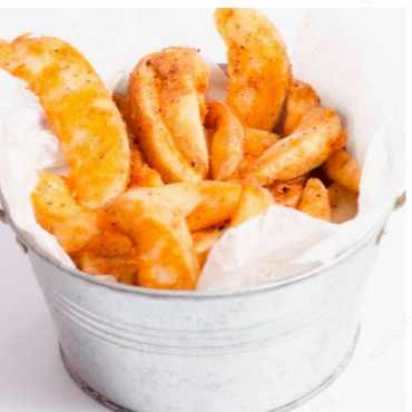 Papas adobadas cortadas en gajos con queso tipo americano fundido, catsup y salsa Valentina.