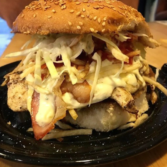 150 Grs de pechuga de pollo con queso gouda, queso Oaxaca, jamón de pavo ahumado, tocino, col, papas ralladas y aderezos.