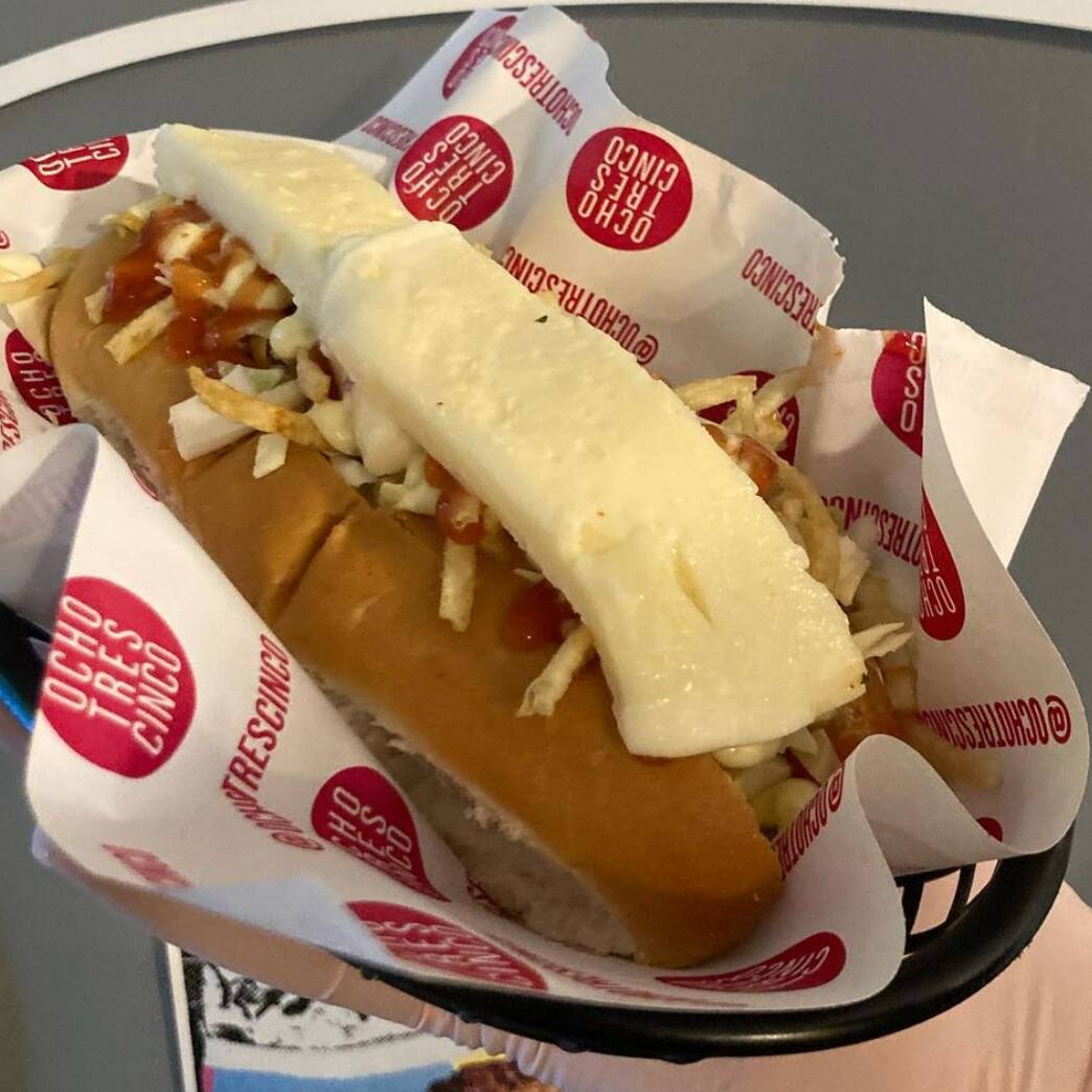 Hot dog de salchicha polaca con col, aderezos, papas ralladas y queso de mano.