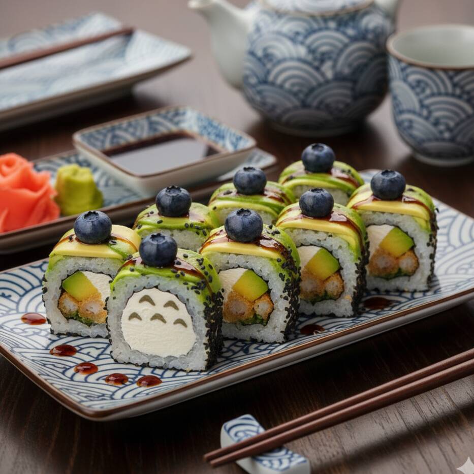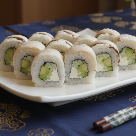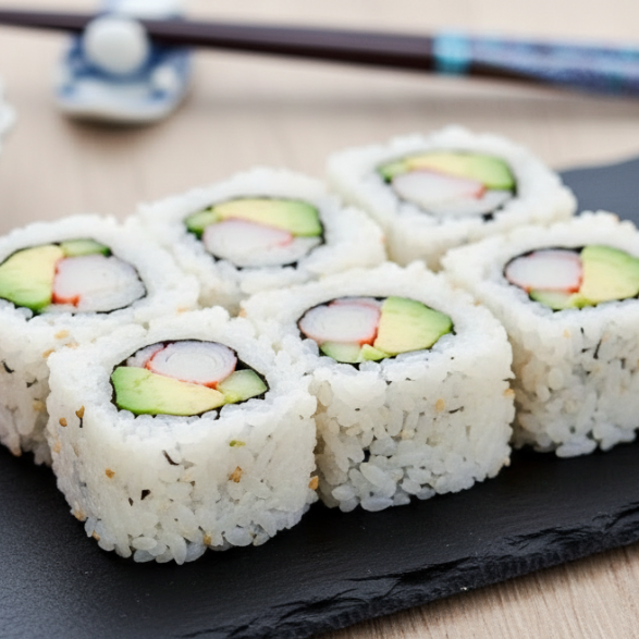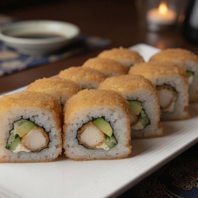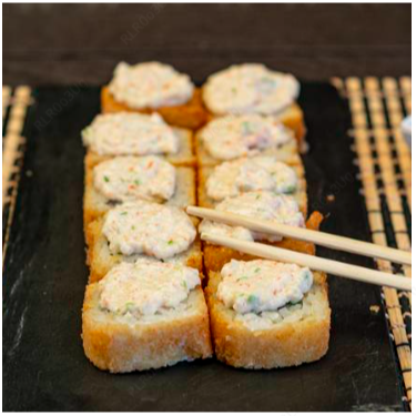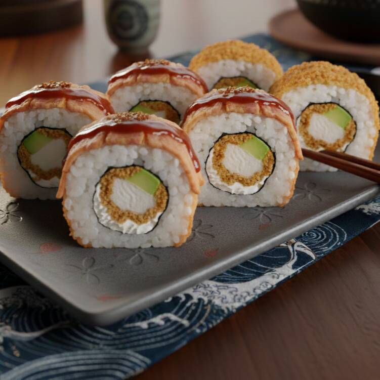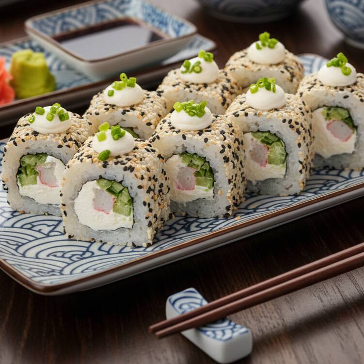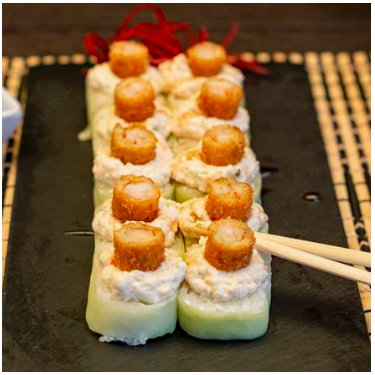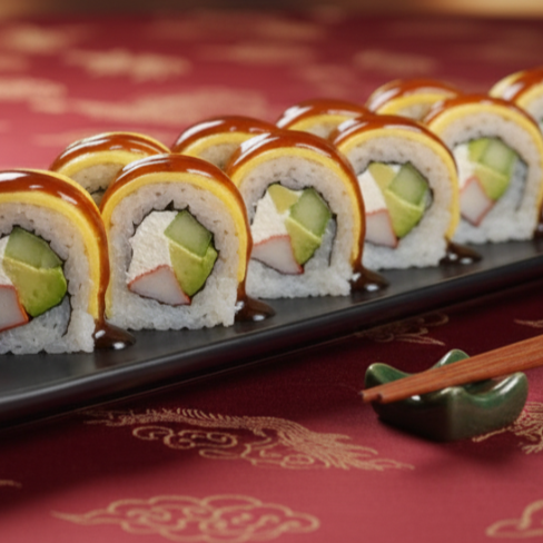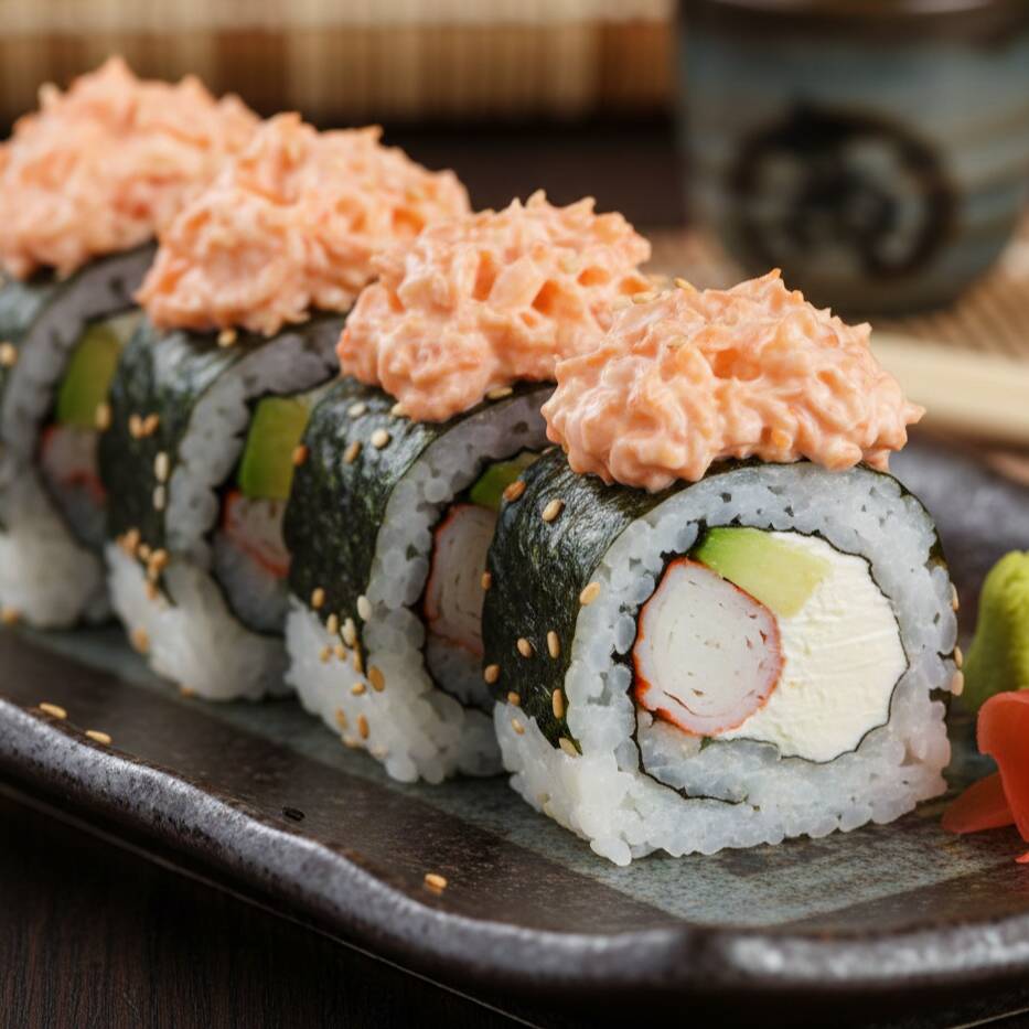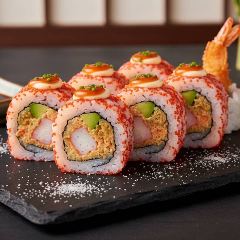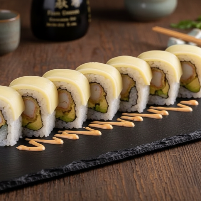 Queso crema, cangrejo y aguacate, hoja de pepino, tampico (complemento popular para el sushi, hecho con surimi, queso crema y mayonesa), bolitas de camarón empanizado y salsa de anguila. Contiene mariscos 🦐. Contiene pescado 🐟.