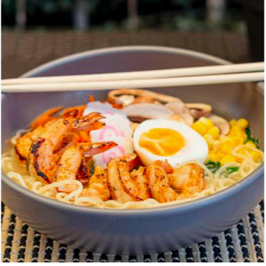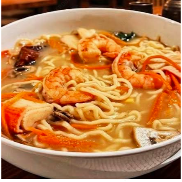 Res o camarón. Fideos, vegetales salteados, naruto y huevo. Contiene pescado 🐟.