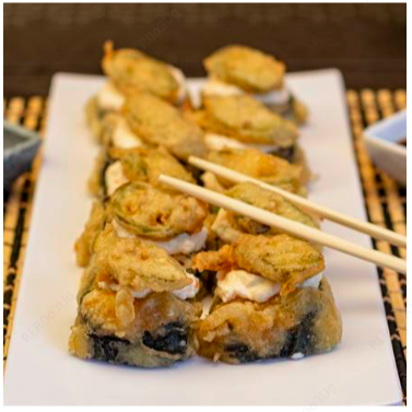Verduras tempura (zanahoria y pimentón), cangrejo, queso crema y aguacate. Kakiage: verduras en rodajas como zanahorias, cebollas, judías verdes o calabaza y camarones. Contiene mariscos 🦐.