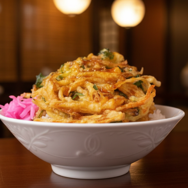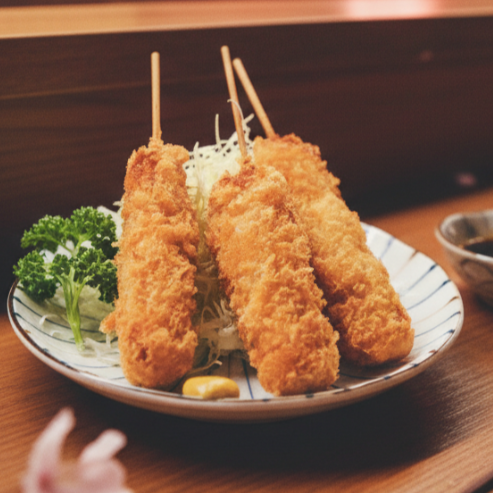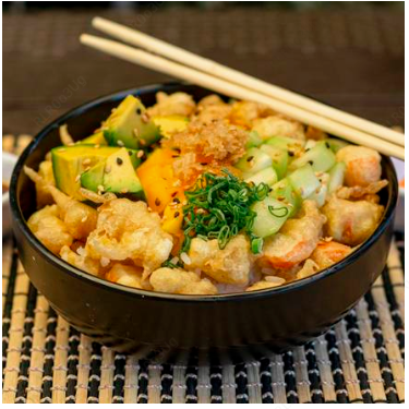 Pollo, camarón y cangrejo. Típica fritura japonesa. Contiene mariscos 🦐.