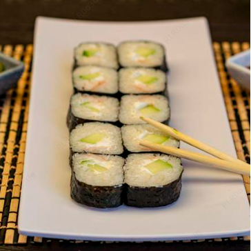 Nori (alga nori), queso crema, pepino y camarón. Contiene mariscos 🦐.