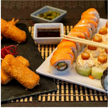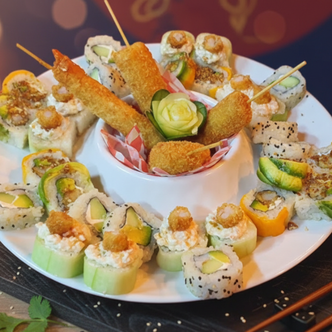2 rollos oishii, 2 rollos especiales, 1 rollo clásico y 6 kushiages.