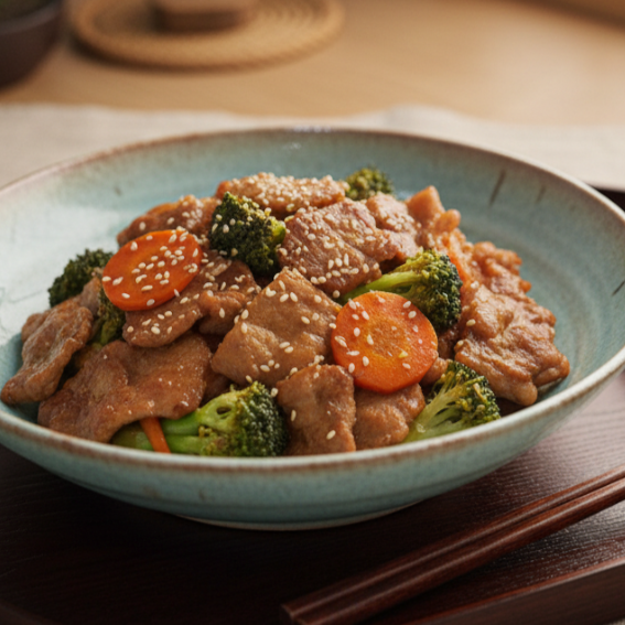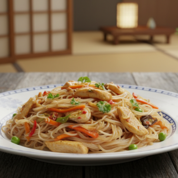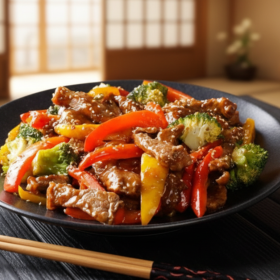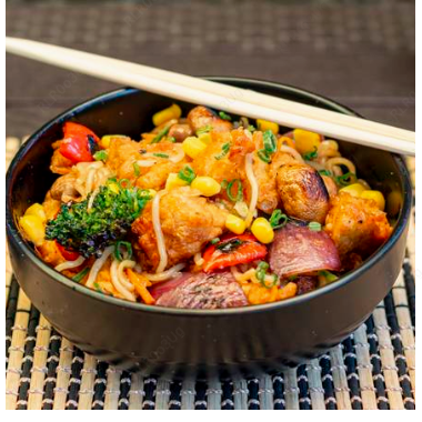 Pollo marinado con ajo y jengibre. Fideos de trigo, salteados en wok con vegetales y salsa teriyaki.
