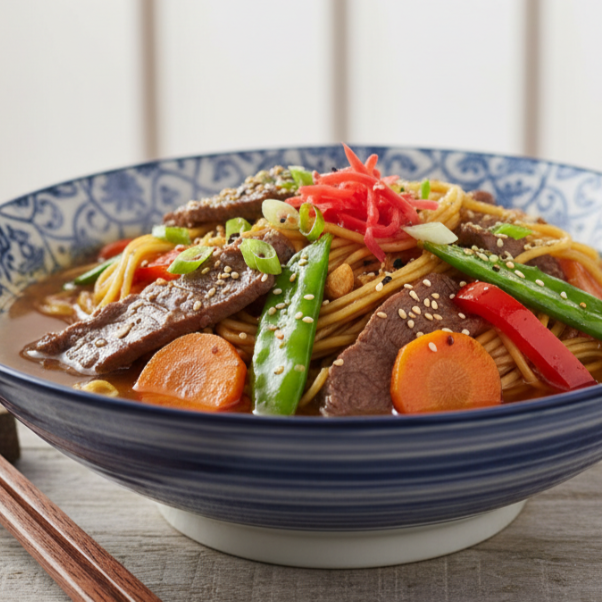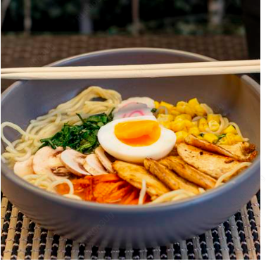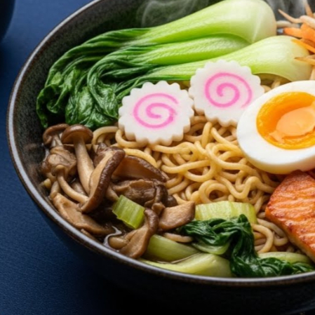 Fideos, vegetales salteados, naruto y huevo. Contiene mariscos 🦐. Contiene pescado 🐟.