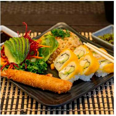 Yakimeshi (huevos esponjosos, jamón sabroso y un toque de salsa de soya que carameliza a la perfección) tampico (complemento popular para el sushi, hecho con surimi, queso crema y mayonesa), ensalada, 1/2 mango roll y 1 pza kushiage camarón con queso. Contiene mariscos 🦐.