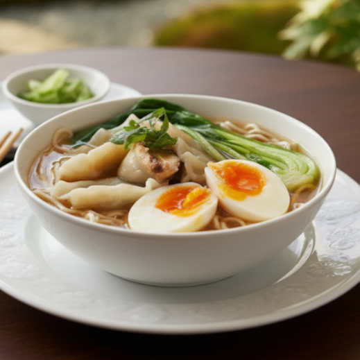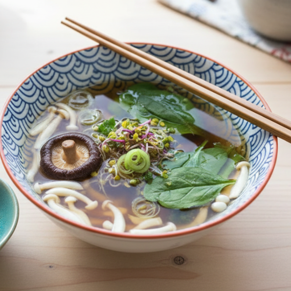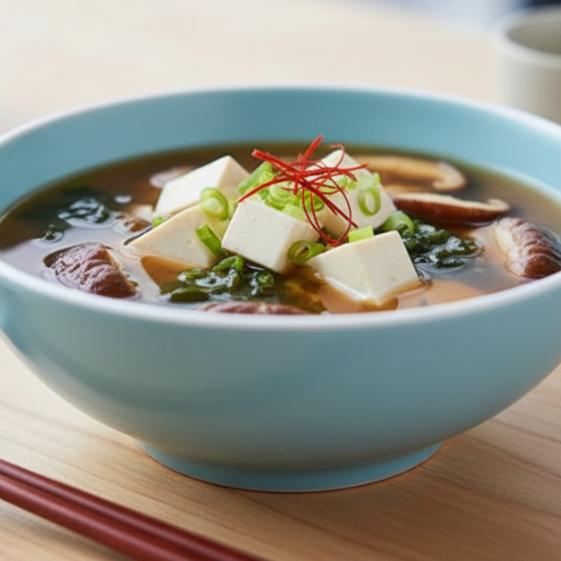 Caldo miso, salsa macha, fideo de arroz, tofu, alga y cebollín. Picante 🌶️.
