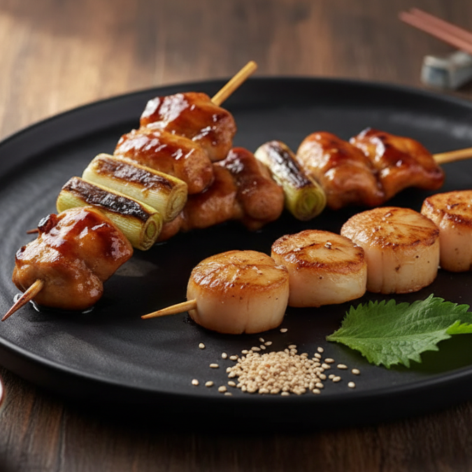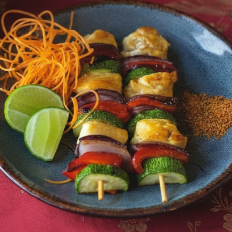 Brochetas a la parrilla, con vegetales y salsa agridulce. Contiene mariscos 🦐.