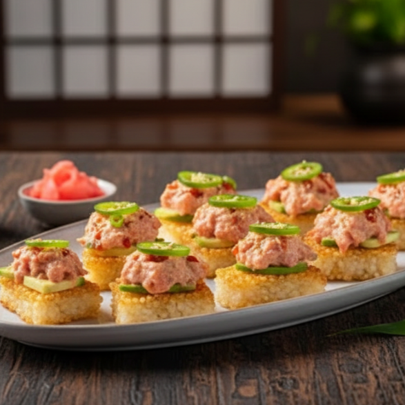 Tostadas de won-ton, tampico (complemento popular para el sushi, hecho con surimi, queso crema y mayonesa), kakiage (verduras en rodajas como zanahorias, cebollas, judías verdes o calabaza y camarones), aguacate y salsa de anguila. Contiene mariscos 🦐. Contiene pescado 🐟.