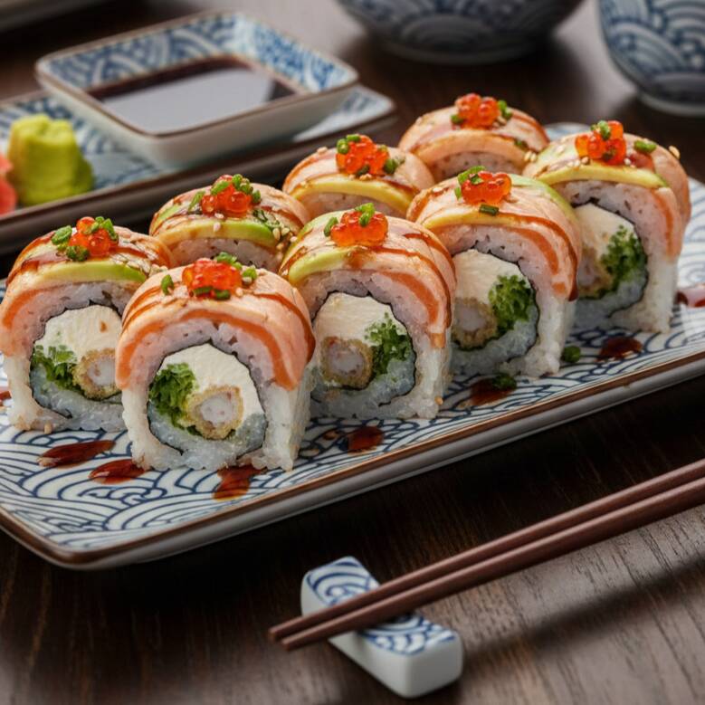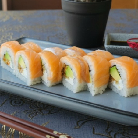 Salmón bbq, queso crema, aguacate, camarón y cebollín. Contiene mariscos 🦐. Contiene pescado 🐟.