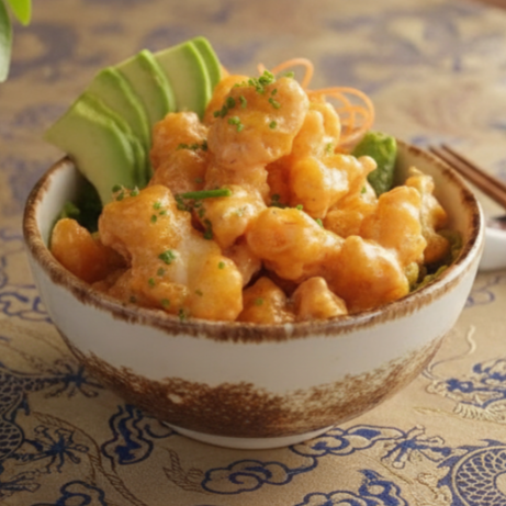 Camarones crujientes bañados en salsa de chipotle, acompañados de ensalada. Contiene mariscos 🦐. Picante 🌶️.