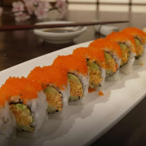 Masago (huevas de pez capelán), camarón tempura, aguacate y tampico (complemento popular para el sushi, hecho con surimi, queso crema y mayonesa). Contiene mariscos 🦐. Contiene pescado 🐟.