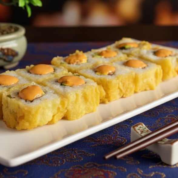 Tampico (complemento popular para el sushi, hecho con surimi, queso crema y mayonesa), aguacate, elote tempura y salsa de anguila. Contiene pescado 🐟.