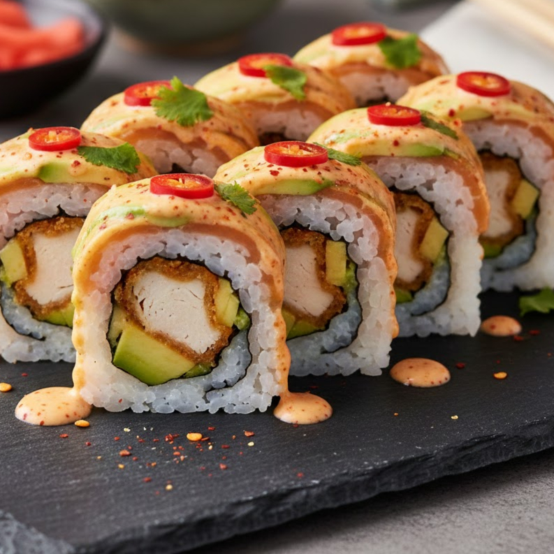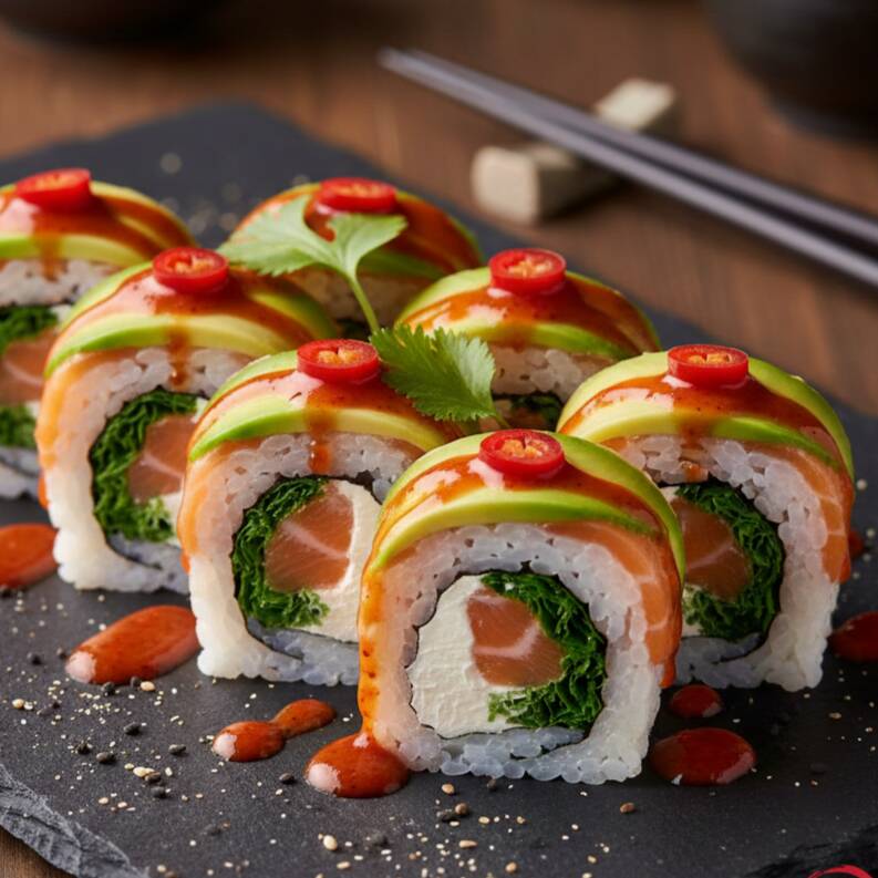 Salmón, queso crema, aguacate, verduras tempura (zanahoria y pimentón), cebollín y aderezo chipotle. Contiene pescado 🐟. Picante 🌶️.