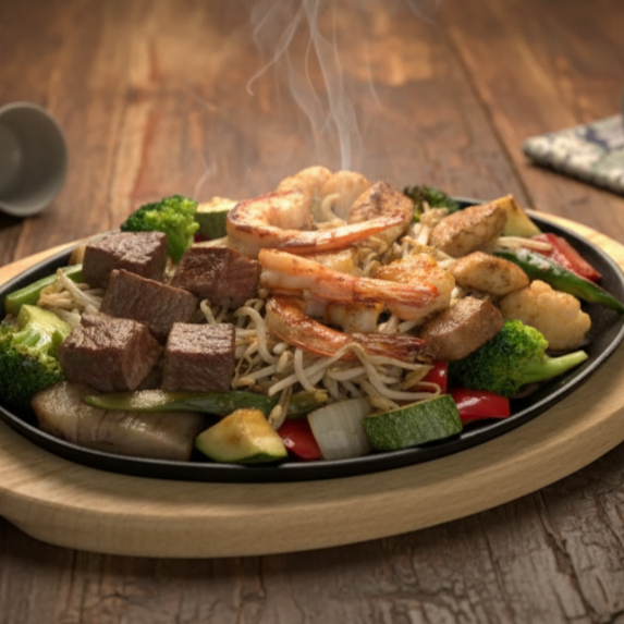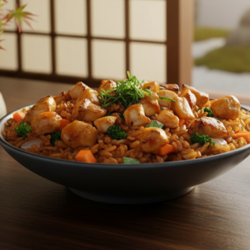 Arroz al vapor con diferentes proteínas, bañado en salsa teriyaki y ensalada. Contiene mariscos 🦐.