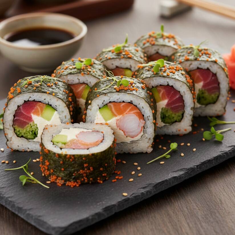 Atún, salmón, camarón, pepino, aguacate, queso crema y masago (huevas de pez capelán). Contiene mariscos 🦐. Contiene pescado 🐟.