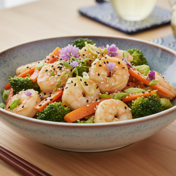 Variedad de vegetales asados a la plancha. Contiene mariscos 🦐.