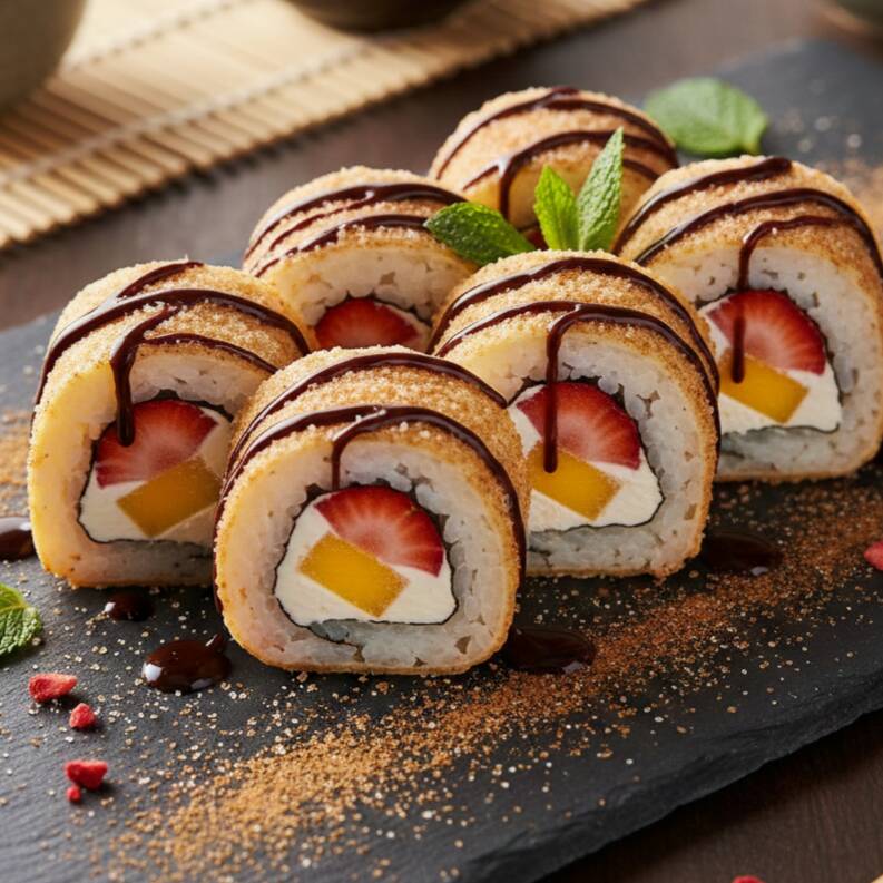 Mango, aguacate y nuez caramelizada, camarón empanizado, queso crema y aguacate. Contiene mariscos 🦐. Contiene nueces 🥜.