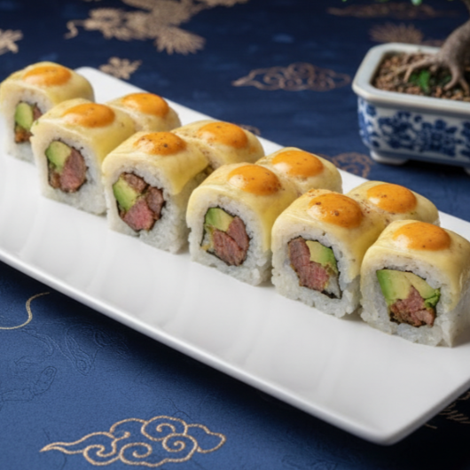 Yakimeshi (huevos esponjosos, jamón sabroso y un toque de salsa de soya que carameliza a la perfección), queso crema, aguacate, filete, aderezo tampico (complemento popular para el sushi, hecho con surimi, queso crema y mayonesa) y chile serrano y habanero tempurizados. Picante 🌶️.
