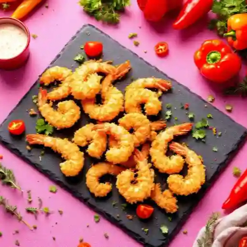 Camarones frescos cubiertos con una capa crujiente de pan rallado y especias, fritos hasta dorarse perfectamente.
