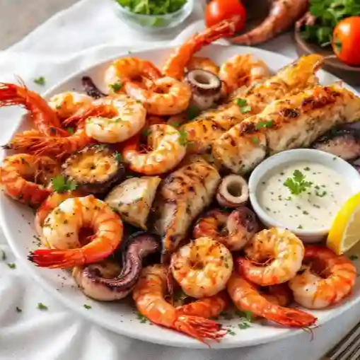 Camarón, pulpo, calamar, pescado, asados a la parrilla y sazonados.