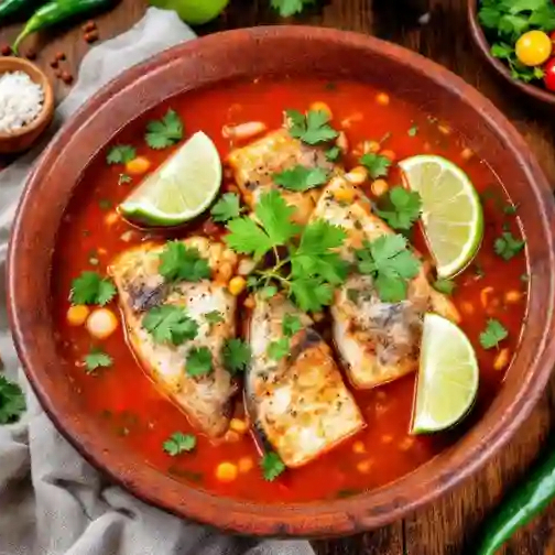 Caldo preparado con filetes de pescado, fondo de jitomate, ajo, cebolla y especias.