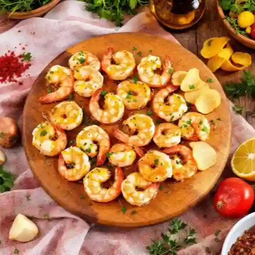 Camarones frescos salteados en mantequilla con abundante ajo.