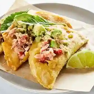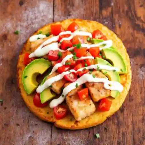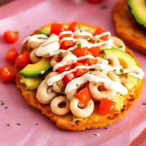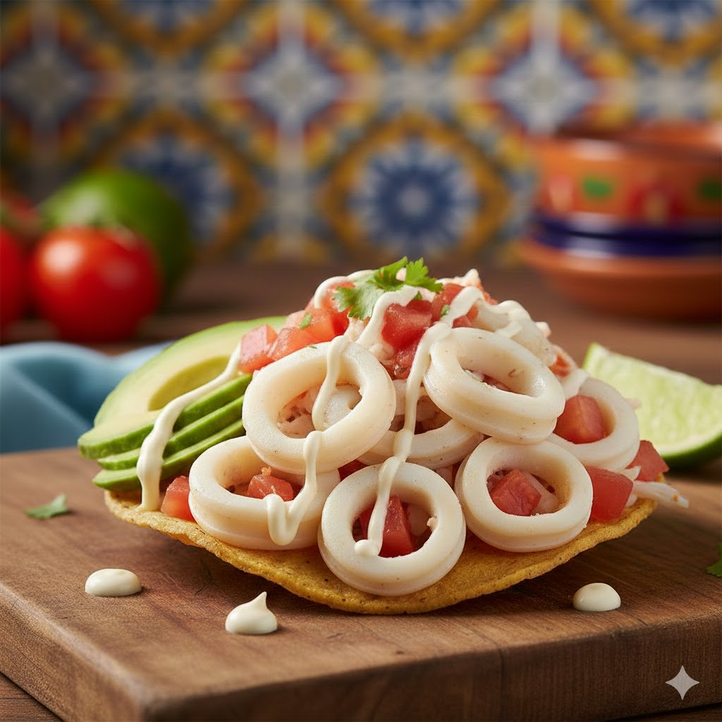 Tostada cubierta con calamar cocido, acompañados de jitomate picado, mayonesa y rebanadas de aguacate.