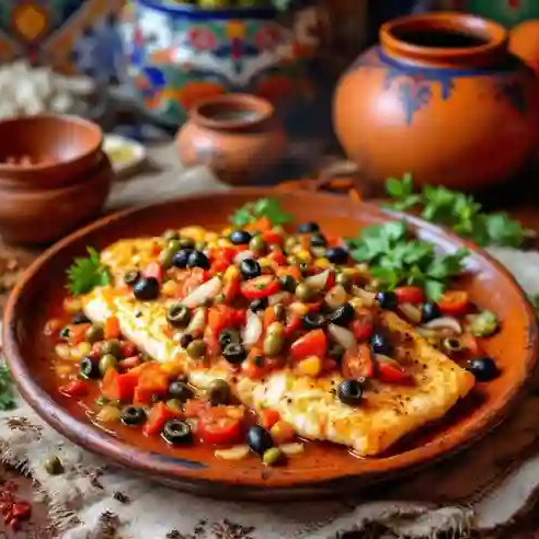 Filete de pescado fresco cocinadoo, bañado en una salsa hecha con jitomate, cebolla, aceitunas, alcaparras y chiles.
