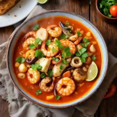 Caldo, preparado con mezcla de mariscos como camarón, pulpo, pescado, jaiba, cocinados en un fondo de jitomate, ajo, cebolla y especias.
