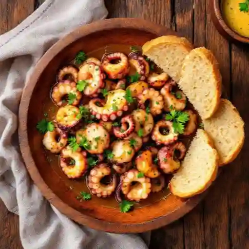 Tiernos trozos de pulpo cocidos y salteados en salsa de mantequilla y ajo.