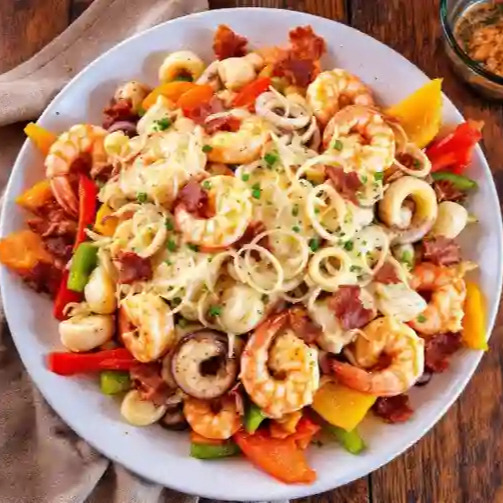 Camarón, pulpo, calamar, salteados con pimientos, cebolla, tocino, gratinado con queso.