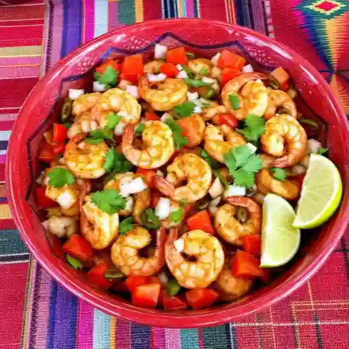 Camarones frescos salteados con jitomate, cebolla, chile verde y cilantro.