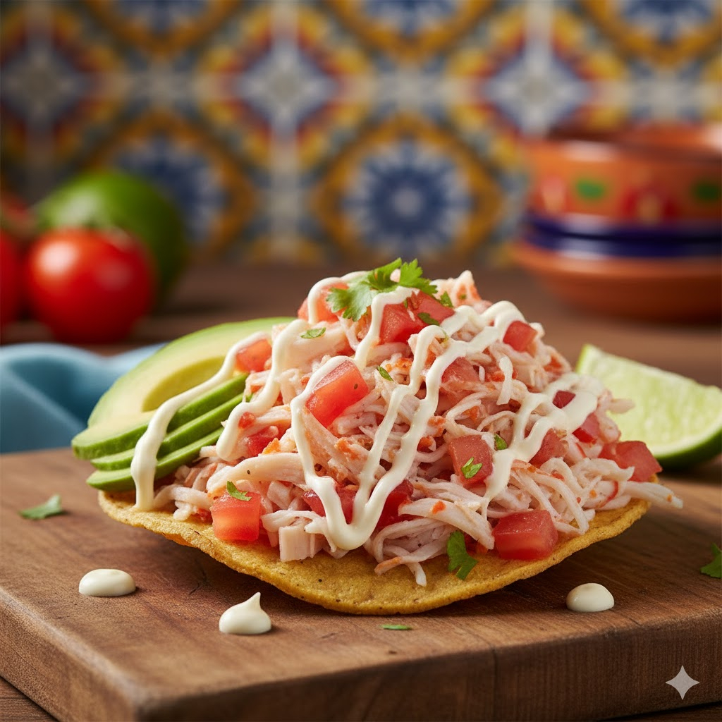 Tostada cubierta con surimi cocido, acompañados de jitomate picado, mayonesa y rebanadas de aguacate.