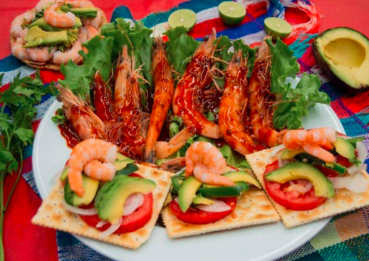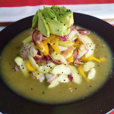 Camaron fresco marinado en soya con citricos, pepino,cebolla,chile serrano y aguacate