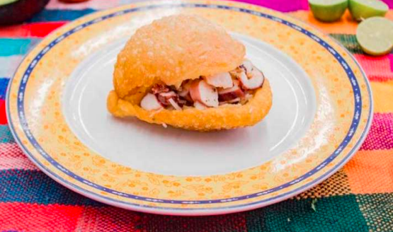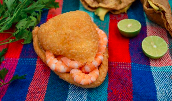 Deliciosa empanada rellena de camarón, pulpo, calamar y pescado acompañada de cebolla, cilantro, aguacate y mayonesa.