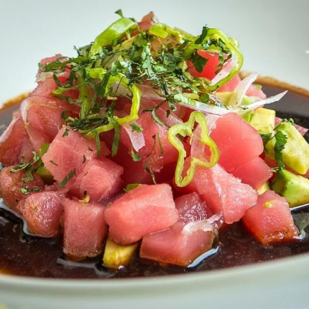 Cubos de atún fresco marinado en soya con cítricos, salsa spicy pepino, cebolla y aguacate.