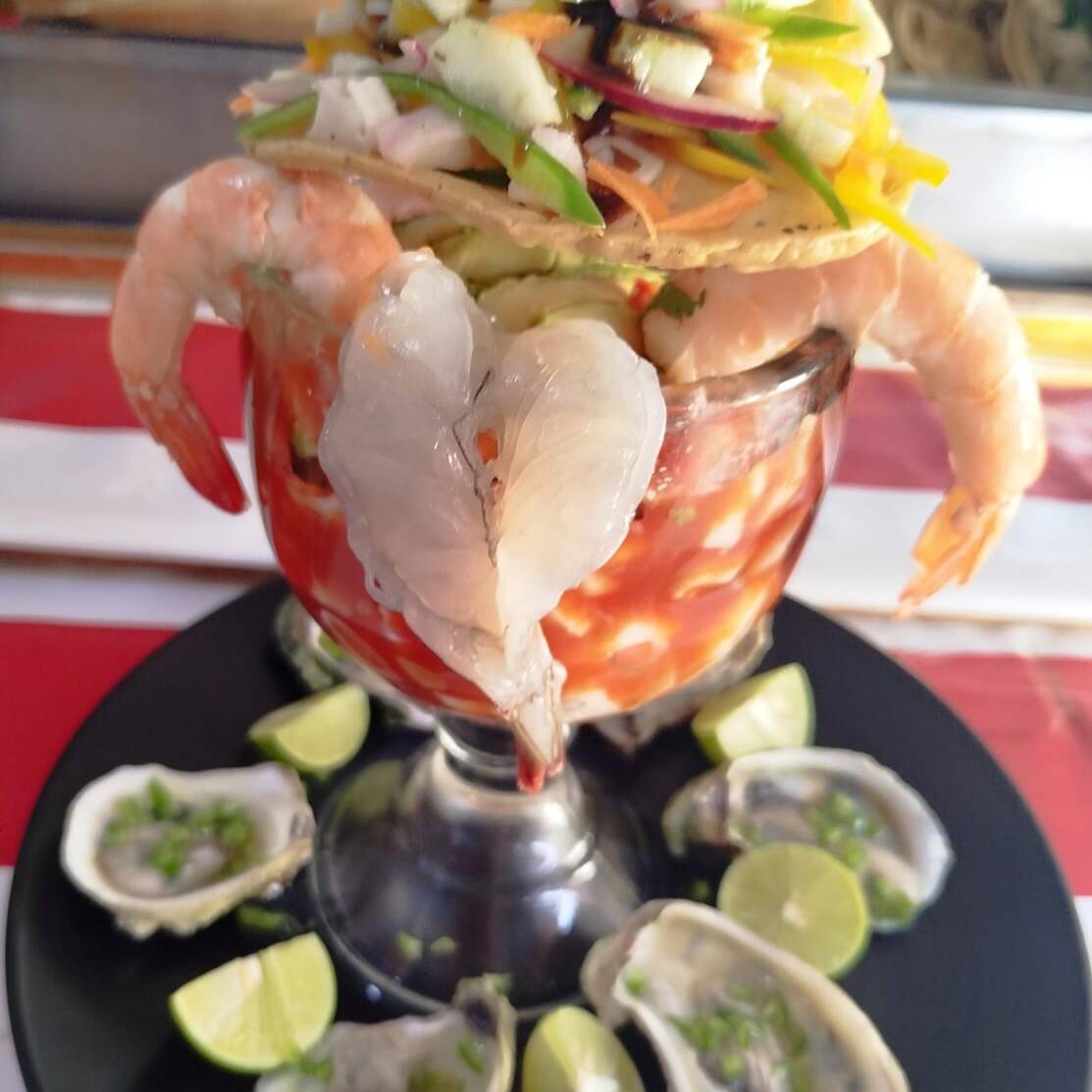 Camarón, pulpo, calamar, pescado,ostión, acompañado con cilandro, cebolla y aguacate