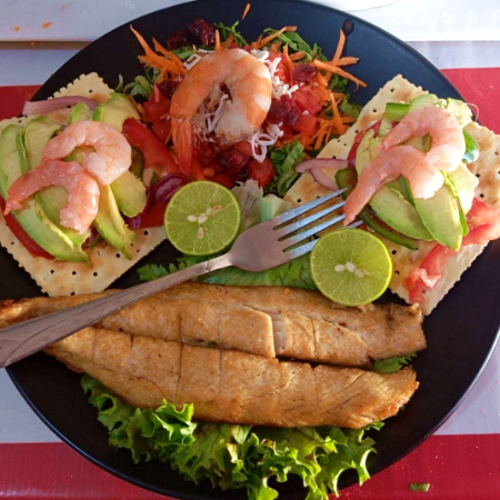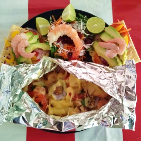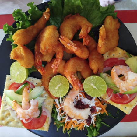 Acompañado de camarón, calamar, pulpo y ensalada con camarones y aderezo de la casa